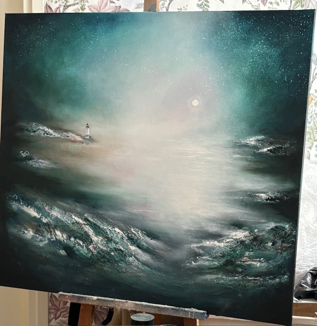 Tummasävyinen, hämyinen ja tunnelmallinen akryylimaalaus. Löydätkö majakan?