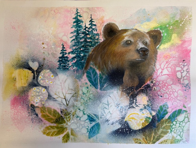 Sekatekniikalla akryylipaperille maalattu karhumaalaus. Koko 30x 40cm. Ei sisällä kehyksiä.