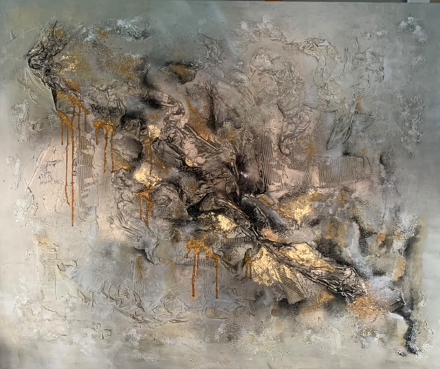 Voimakkaasti strukturoitu ja erilaisia pintoja sisältävä akryylimaalaus. Teos on ripustusvalmis ja sen on suojalakattu.